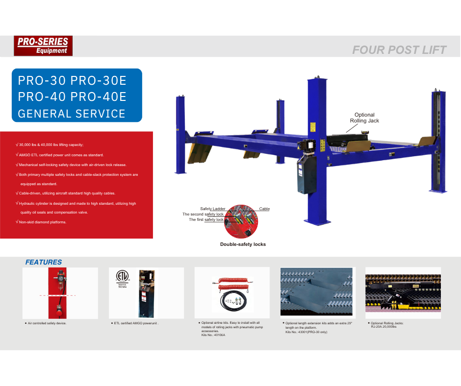 Meet the workhorse of your truck shop. The AMGO PRO series heavy-duty four-post lifts deliver serious capacity, rock-solid stability, and service-bay-friendly ergonomics for Class-5–7 trucks, buses, RVs, and utility fleets. Choose 30,000 lb (PRO-30 / PRO-30E) or step up to 40,000 lb (PRO-40 / PRO-40E) to handle your heaviest vehicles with confidence. Each lift comes equipped with an ETL-certified power unit, mechanical self-locking system with air-driven lock release, primary multi-position safety locks, and a cable-slack protection system—engineered to keep techs safe and productive shift after shift. Cable-driven architecture with aircraft-standard, high-quality cables and a high-spec hydraulic cylinder (premium oil seals + compensation valve) keep operation smooth and consistent under load. Non-skid diamond platforms add confidence when driving on and off, even in wet shop conditions.
